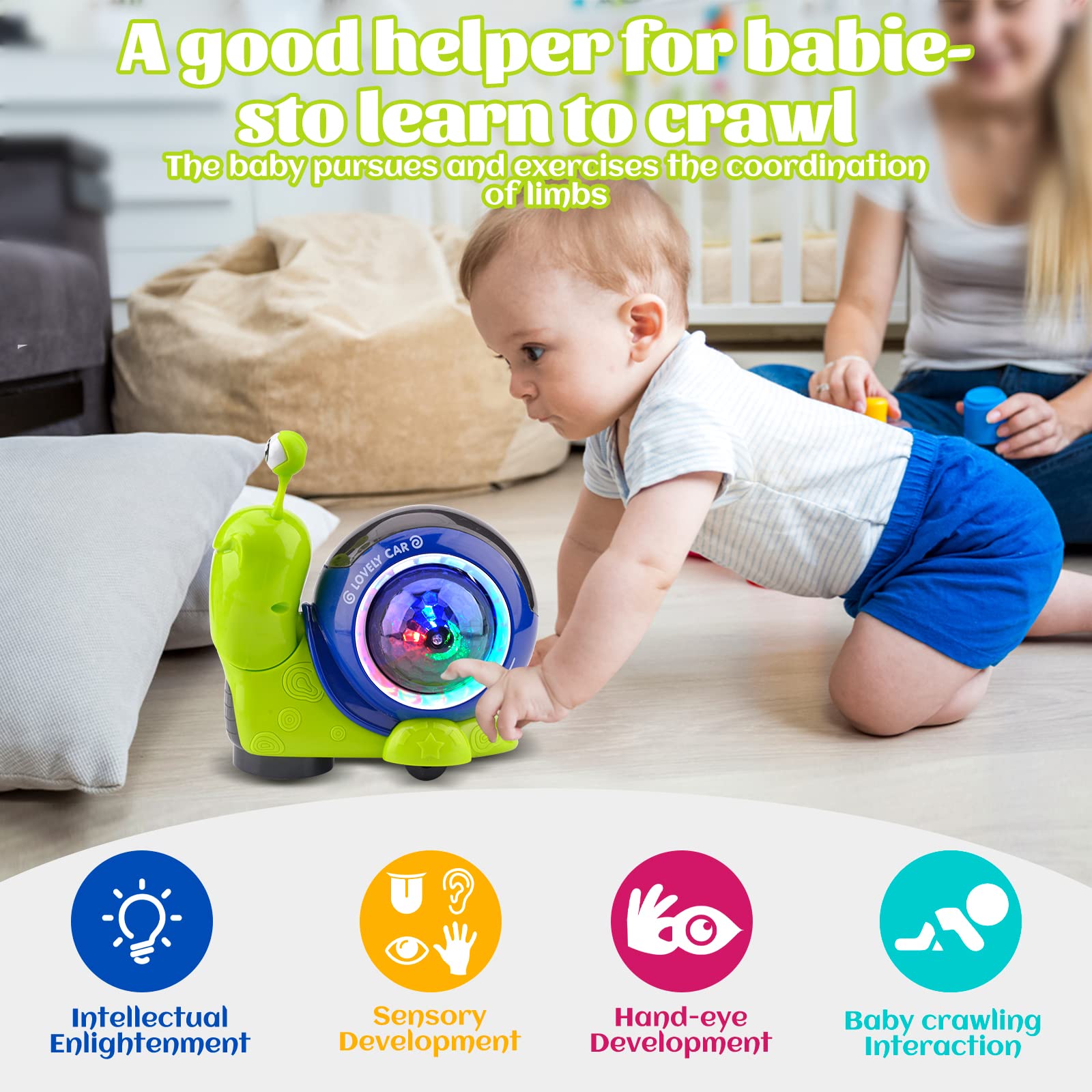 Early learning and development: Designed in a cute snail shape, this toy encourages children to crawl after it, helping them to recognise animals and improve their hand-eye coordination and motor skills.