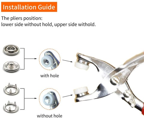 - For each set of snaps, you will need one male snap, one female snap, and two hollow prong rings.